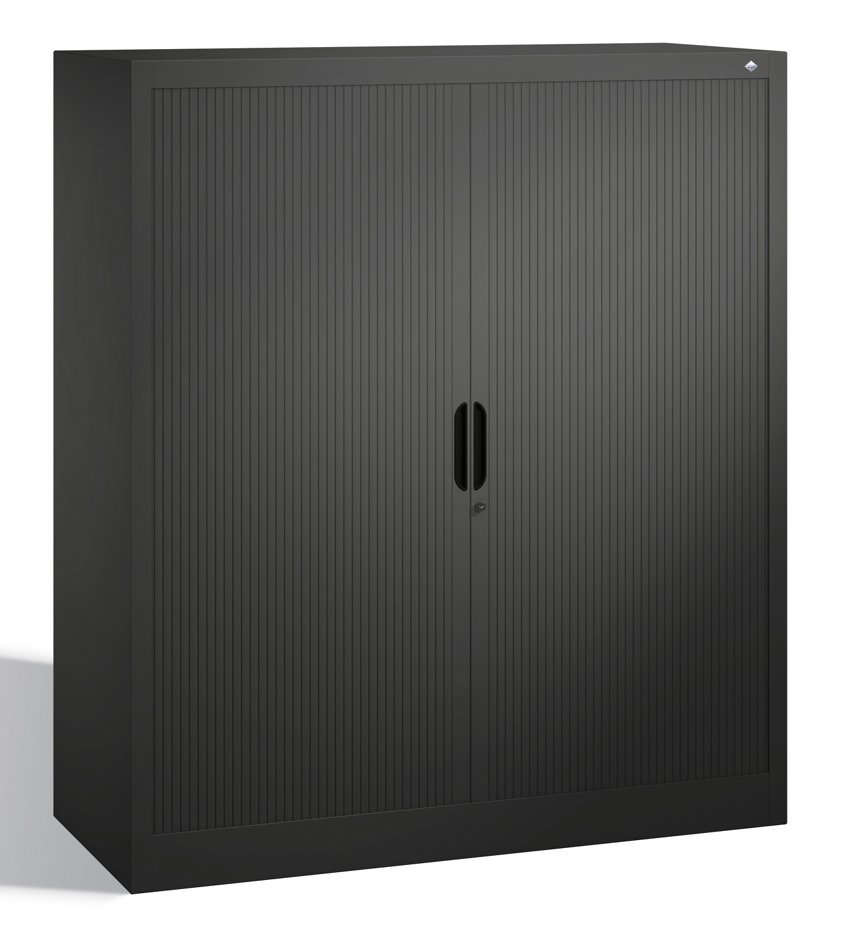 Roletová kovová skříň dvoudveřová. Výška 1345, šířka 1200, hloubka 420 mm. 3 police. Barva korpusu a rolety světle šedá RAL 7035/antracit RAL 7021.