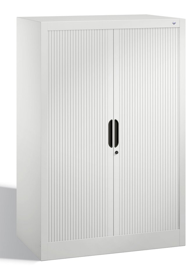 Roletová kovová skříň dvoudveřová. Výška 1230, šířka 800, hloubka 420 mm. 2 police. Barva korpusu a rolety světle šedá RAL 7035 celý popis a parametry