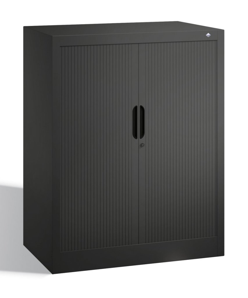 Roletová kovová skříň dvoudveřová. Výška 1030, šířka 800, hloubka 420 mm. 2 police. Barva korpusu a rolety světle šedá RAL 7035/antracit RAL 7021.