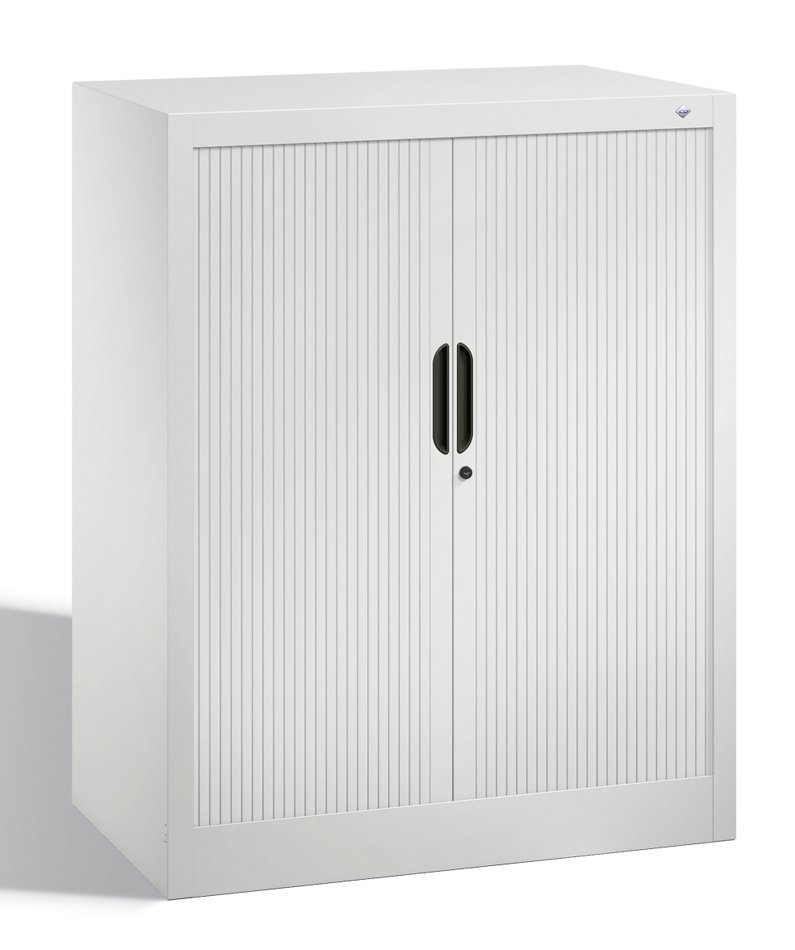 Roletová kovová skříň dvoudveřová. Výška 1030, šířka 800, hloubka 420 mm. 2 police. Barva korpusu a rolety světle šedá RAL 7035 celý popis a parametry