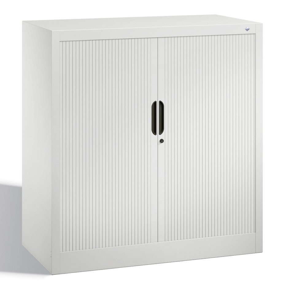 Roletová kovová skříň dvoudveřová. Výška 1030, šířka 1000, hloubka 420 mm. 2 police. Barva korpusu a rolety světle šedá RAL 7035 celý popis a parametry