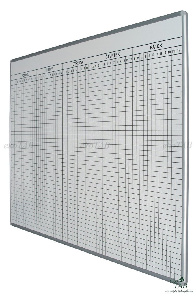 Rozvrhová magnetická tabule. Tabule se vyrábí ve dvou velikostech: do 26 tříd 0 - 8 hodin, do 40 tříd 1 - 12 hodin. Rám tabule z eloxovaného hliníku, plastové rohy. Dodáváno včetně montážní sady na stěnu.
