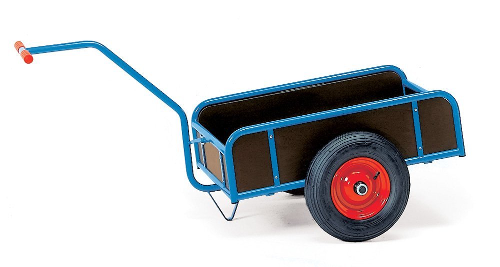 Ruční vozík dvoukolový německé výroby, konstrukce ze svařované oceli, ložná plocha z protiskluzové překližky. Dvě pneumatická kola celý popis a parametry