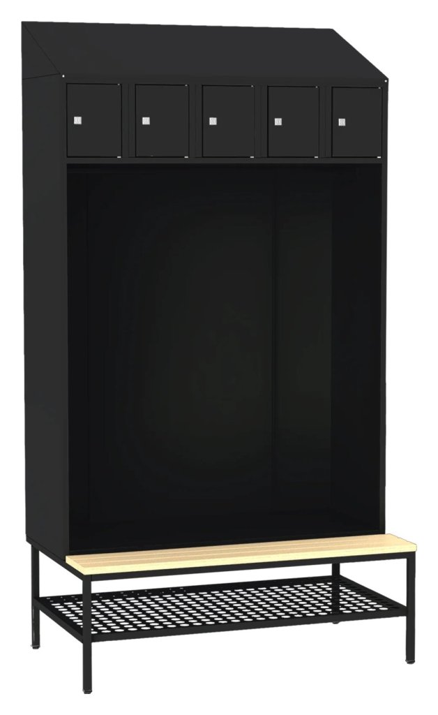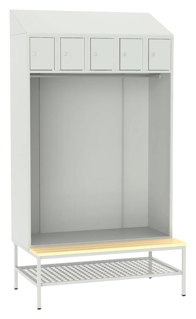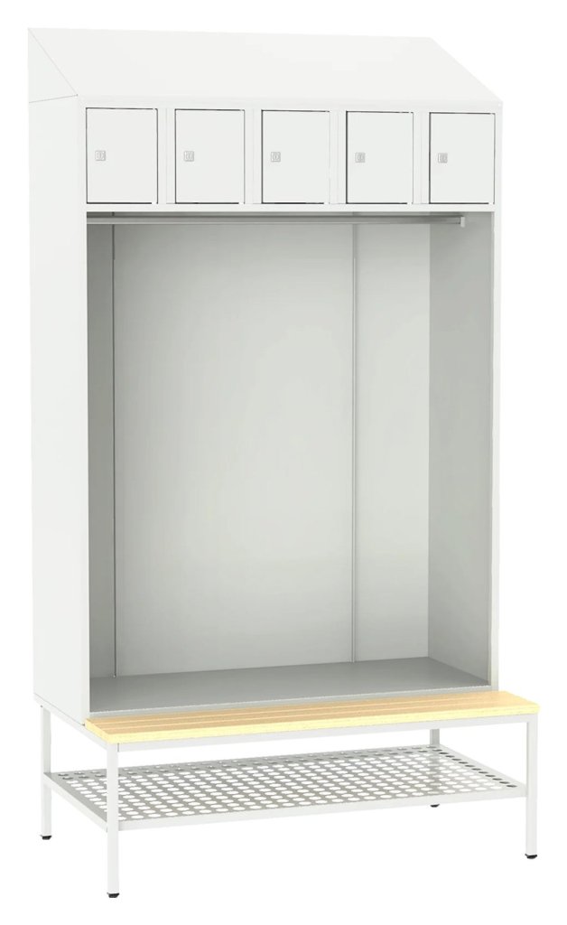Otevřené šatnové sestavy jsou praktickým řešením společenských místností či šaten, kde není nutné oblečení uzavírat do samostatných skříní. 5x úložný box na drobné osobní předměty, šatní tyč na ramínka, dřevěná lavička, děrovaný odkládací rošt na obuv. 16 barevných odstínů na výběr v ceně bez příplatku.