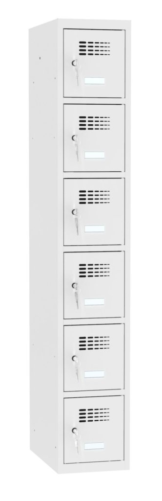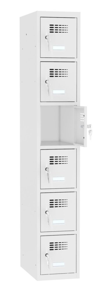 Šestidveřová šatní kovová skříňka se svařovanou konstrukcí a moderním designem ventilačního systému. Výška 1800 x šířka 300 x hloubka 500 mm. Na dveřích samolepící štítek na jméno. 16 barevných odstínů na výběr v ceně bez příplatku. Různé druhy zamykání.