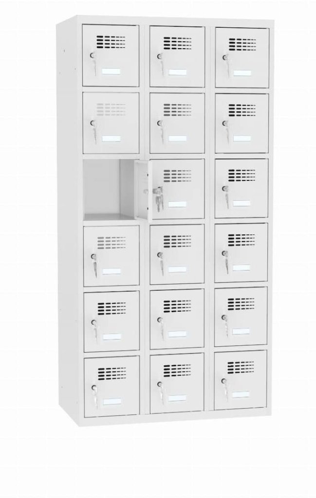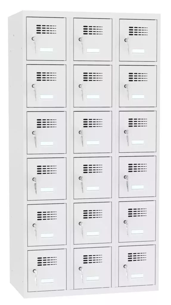 Osmnáctidveřová šatní kovová skříňka se svařovanou konstrukcí a moderním designem ventilačního systému. Výška 1800 x šířka 900 x hloubka 500 mm. Na dveřích samolepící štítek na jméno. 16 barevných odstínů. Různé druhy zamykání.