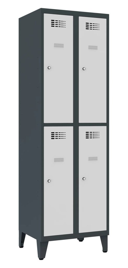 Čtyřdveřová šatní kovová skříňka se svařovanou konstrukcí a moderním designem ventilačního systému. Výška 1800 x šířka 600 x hloubka 500 mm. Standardní vybavení: tyč s háčky, samolepící štítek na jméno. 16 barevných odstínů. Různé druhy zamykání.