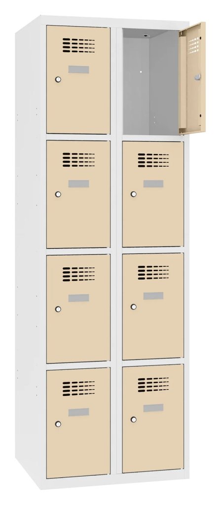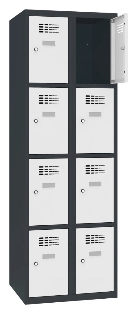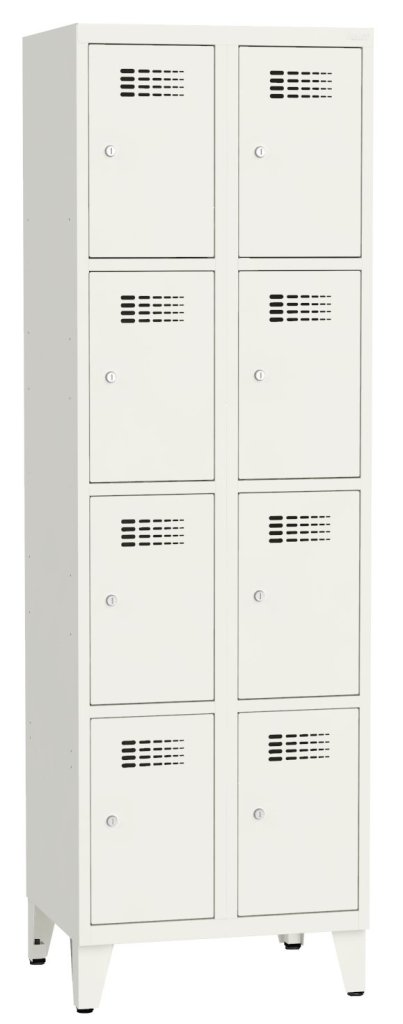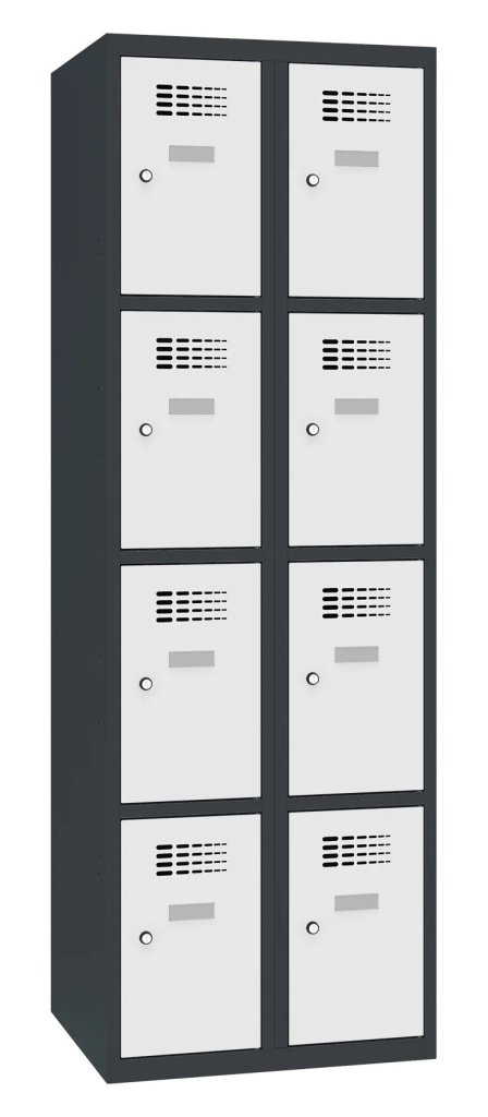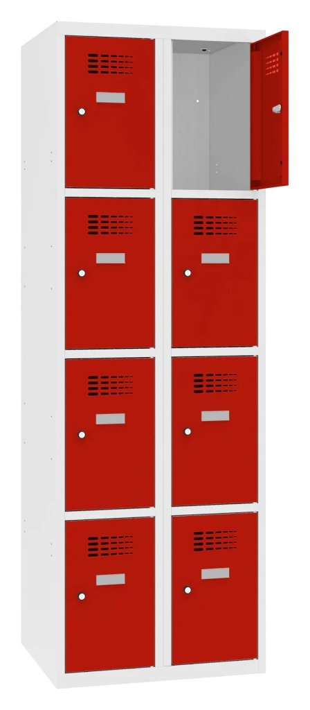 Osmidveřová šatní kovová skříňka se svařovanou konstrukcí a moderním designem ventilačního systému. Výška 1800 x šířka 600 x celý popis a parametry