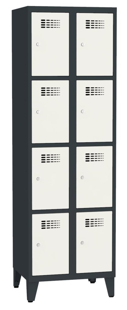 Čtyřdveřová šatní kovová skříňka se svařovanou konstrukcí a moderním designem ventilačního systému. Výška 1800 x šířka 300 x hloubka 500 mm. Na dveřích samolepící štítek na jméno. 16 barevných odstínů na výběr v ceně bez příplatku. Různé druhy zamykání.