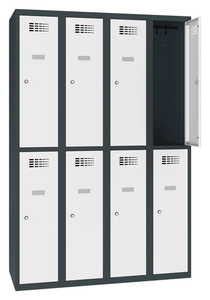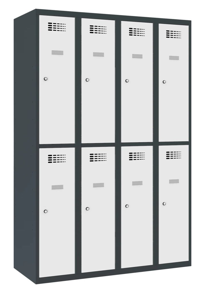 Osmidveřová šatní kovová skříňka se svařovanou konstrukcí a moderním designem ventilačního systému. Výška 1800 x šířka 1200 x celý popis a parametry