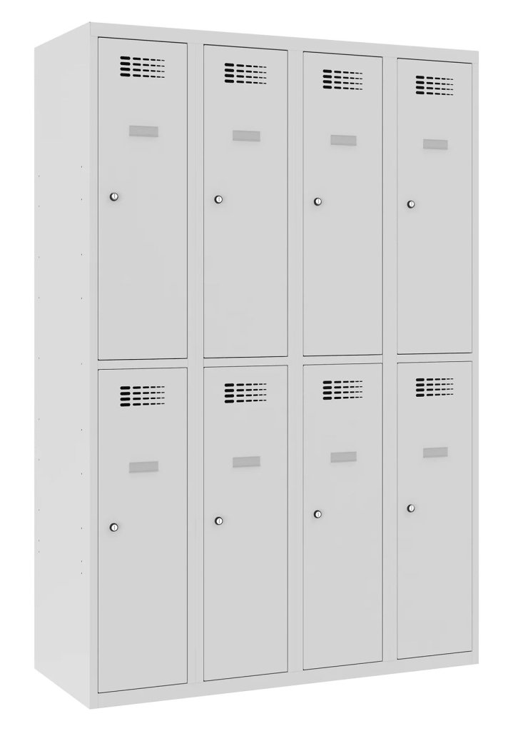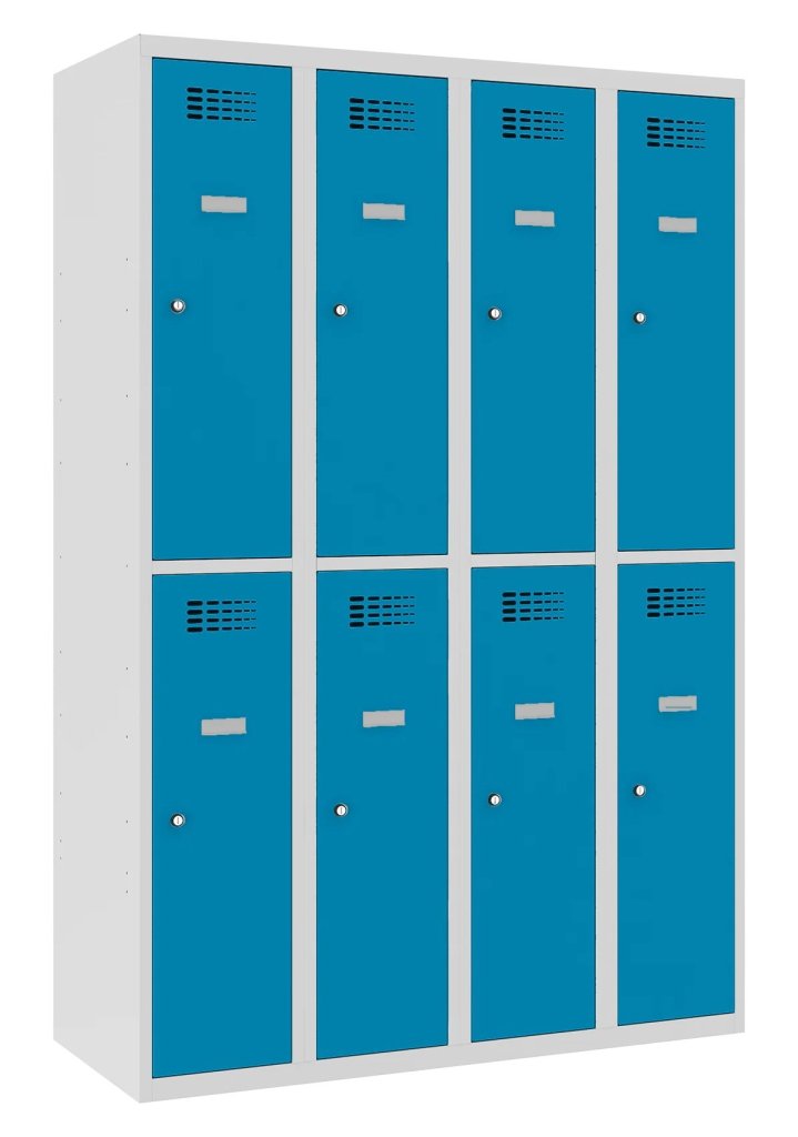 Čtyřdveřová šatní kovová skříňka se svařovanou konstrukcí a moderním designem ventilačního systému. Výška 1800 x šířka 600 x hloubka 500 mm. Standardní vybavení: tyč s háčky, samolepící štítek na jméno. 16 barevných odstínů. Různé druhy zamykání.
