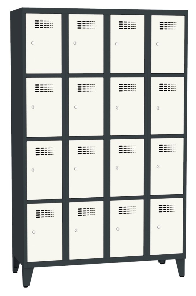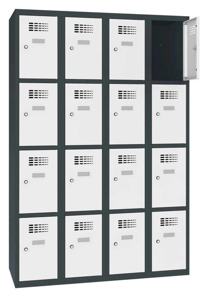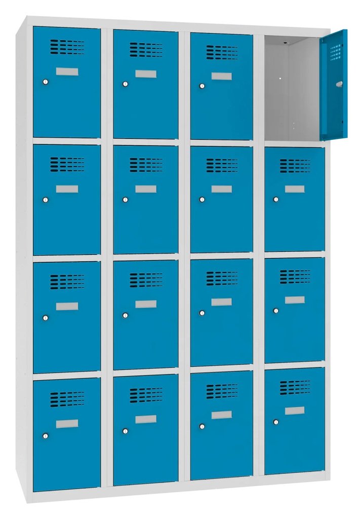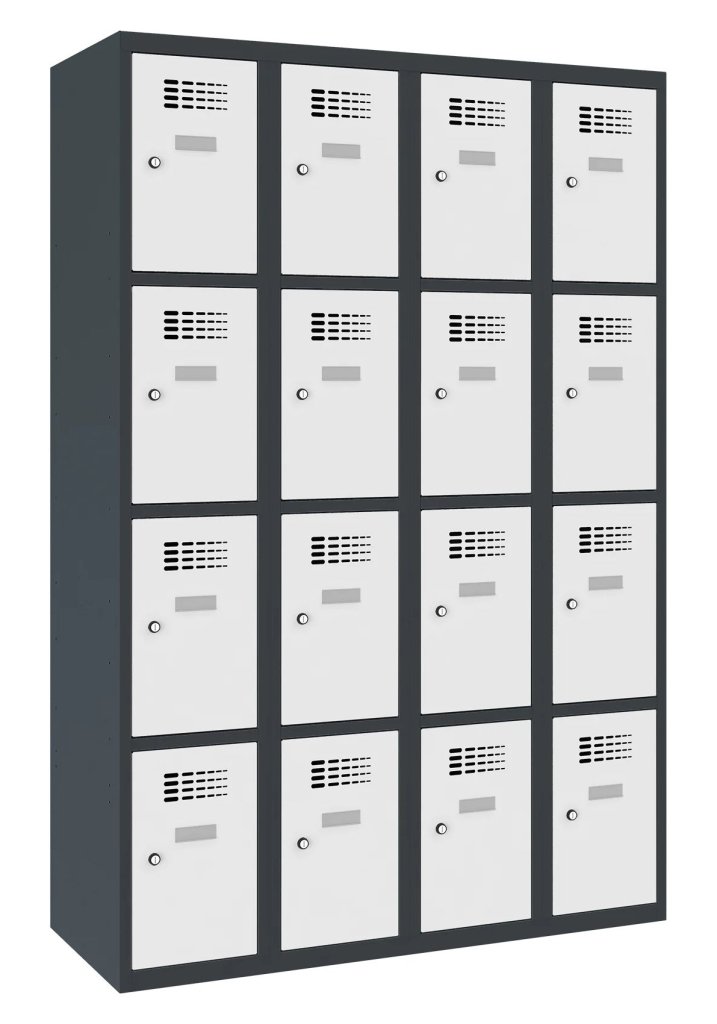 Šestnáctidveřová šatní kovová skříňka se svařovanou konstrukcí a moderním designem ventilačního systému. Výška 1800 x šířka 1200 x celý popis a parametry
