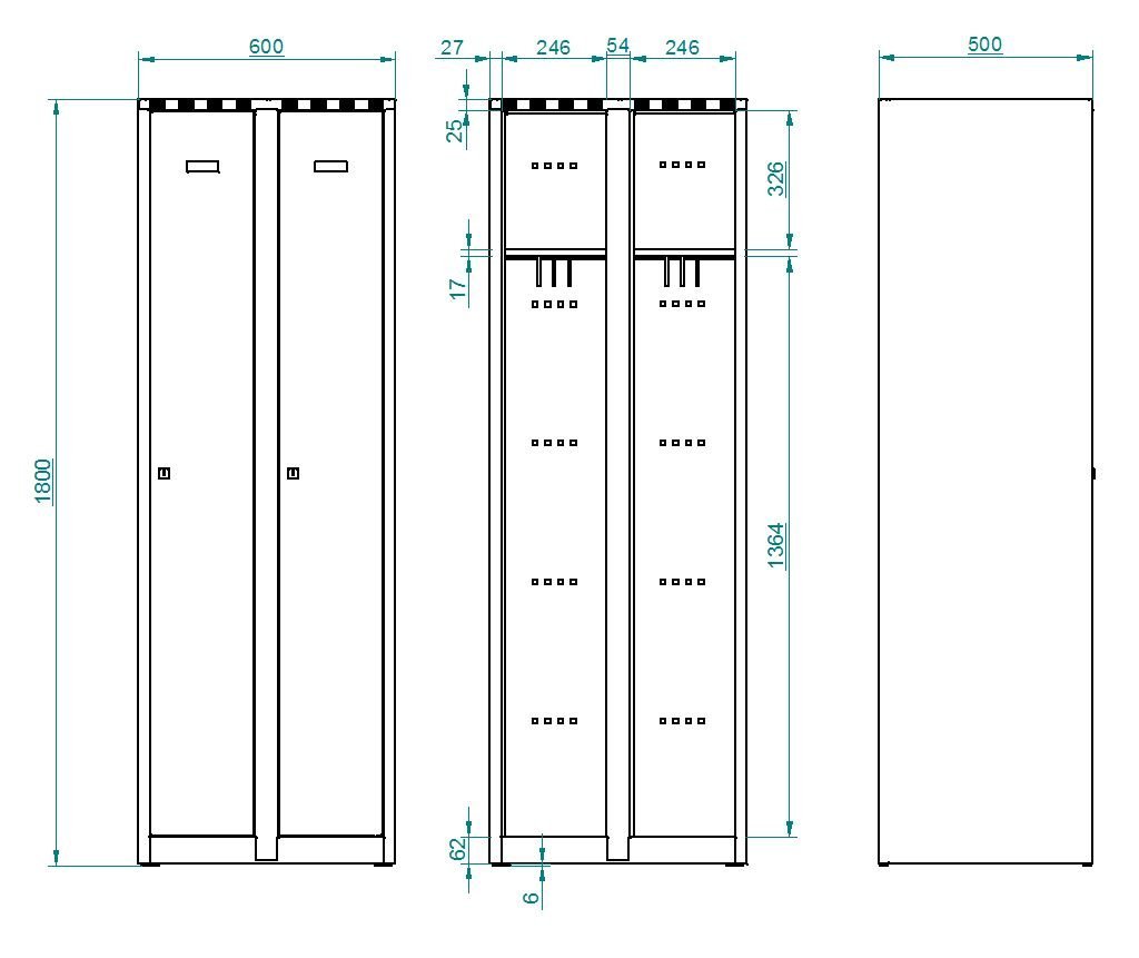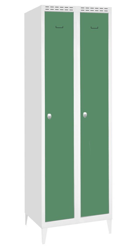 Dvoudveřová šatní skříňka svařovaná s dvouplášťovými dveřmi pro větší bezpečnost, výška 1800 x šířka 600 x hloubka 500 mm. Uzamykání na cylindrický zámek nebo uzávěr pro visací zámek, vnitřní vybavení každého oddělení police s tyčí na ramínka a háček. Na přání s navařenými nohami - výška skříně s nohami 1950 mm. Barva korpusu RAL 7035 světle šedá.