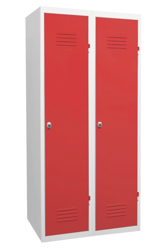 Dvoudveřová kovová šatní skříňka na soklu šířka 600, výška 1800, hloubka 500 mm, cylindrický zámek nebo uzávěr pro visací zámek. Možnost kombinace s lavicí typ A7660. Barva korpusu RAL 7035 světle šedá.