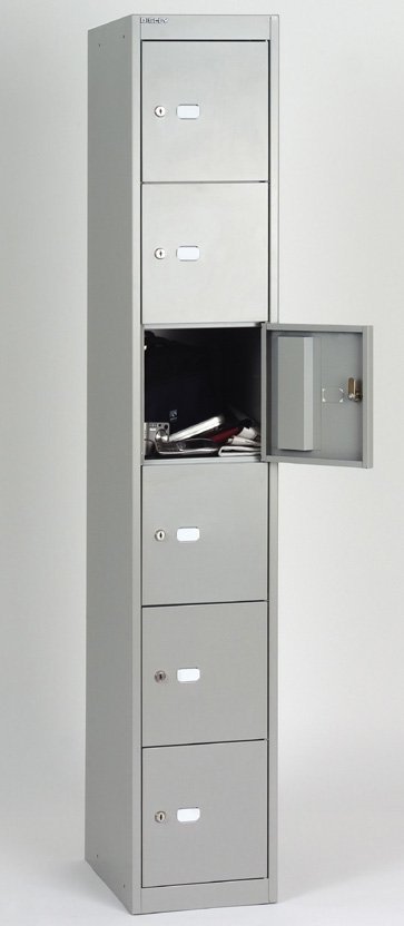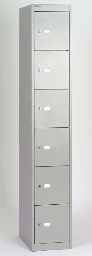 Šestidveřová kovová šatní skříňka šířka 305, výška 1802, hloubka 305 mm. Uzamykání cylindrickým zámkem s dvěma klíči s možností náhrady zámku uzávěrem pro visací zámek nebo kódovým zámkem.