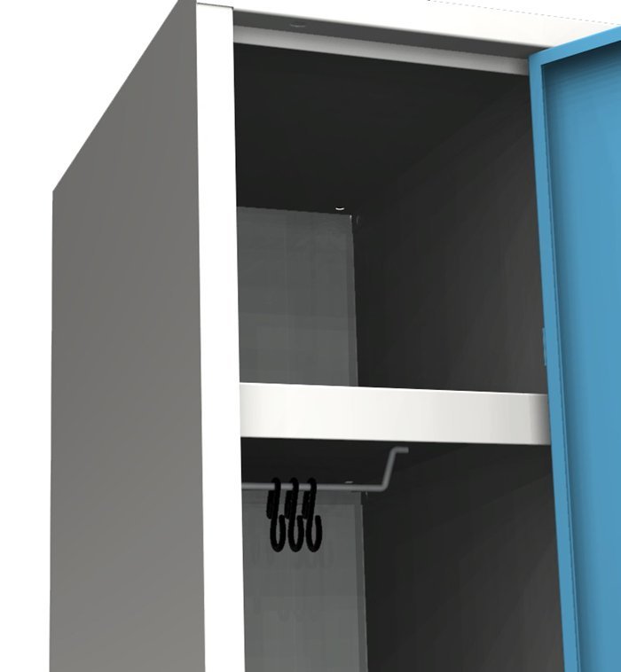 Dvoudveřová šatní skříňka svařovaná s moderním designem ventilačního systému. Výška 1800 x šířka 600 x hloubka 500 mm. Cylindrický zámek. Vybavení obou oddělení: tyč s dvěma háčky, háček na ručník, police nad tyčí, zrcátko, samolepící štítek na jméno.