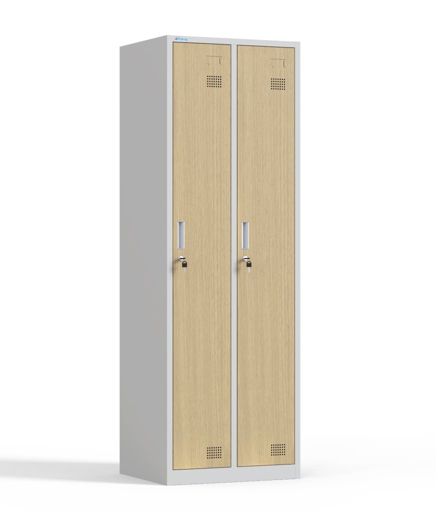 Dvouoddílový svařovaný šatník výška 1800 x šířka 600 x hloubka 493 mm. Uzamykání cylindrickým zámkem se dvěma klíči, nebo otočným zámkem pro visací zámek. Barva korpusu světle šedá, dveře HPL lamino v dezénu modrá, světle zelená nebo světle oranžová. V každém oddílu je ohyb zabraňující vtlačení dveří dovnitř skříně a vypáčení zámku.