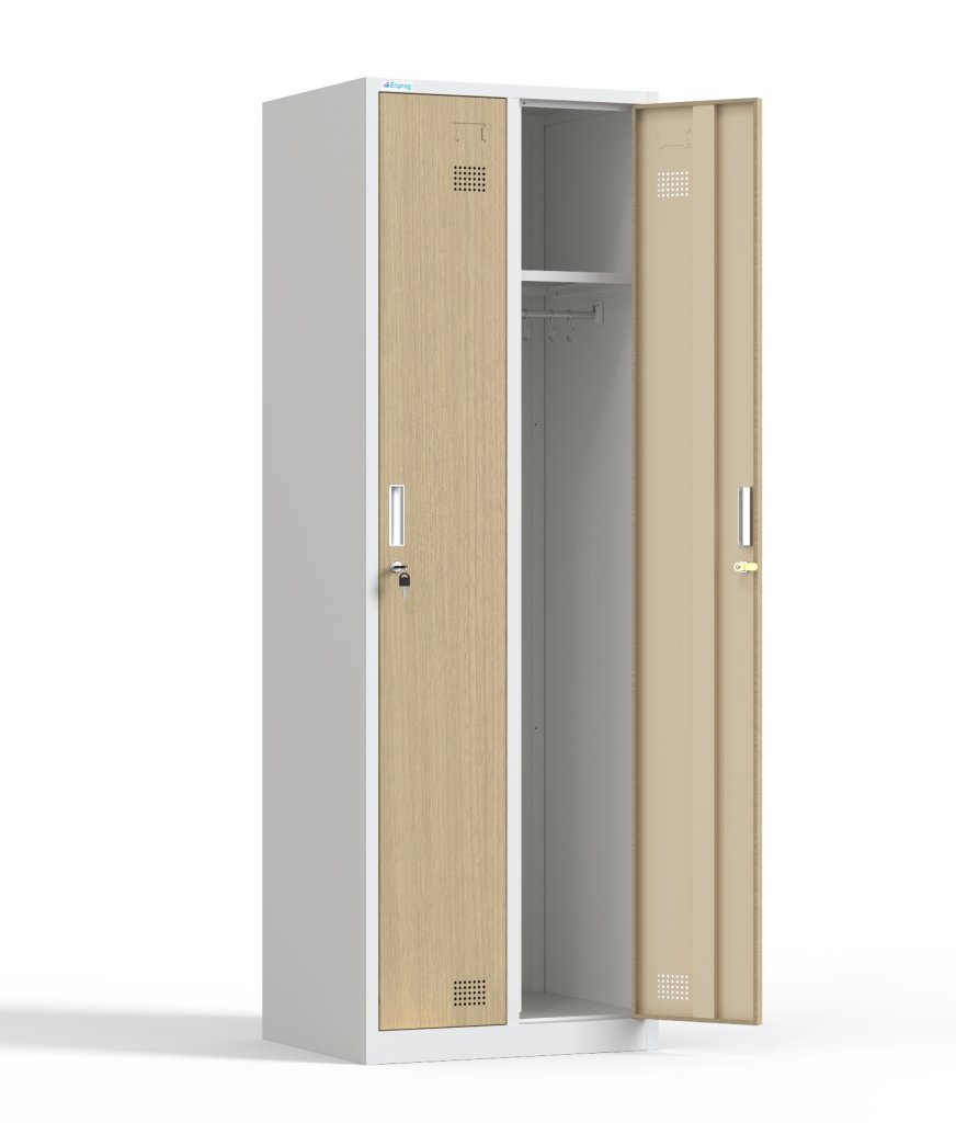 Dvoudveřová šatní skříňka svařovaná s moderním designem ventilačního systému. Výška 1800 x šířka 600 x hloubka 500 mm. Cylindrický zámek. Vybavení obou oddělení: tyč s dvěma háčky, háček na ručník, police nad tyčí, zrcátko, samolepící štítek na jméno.