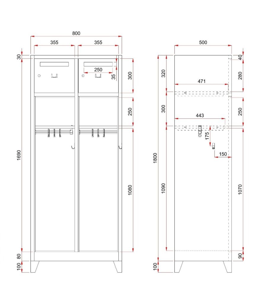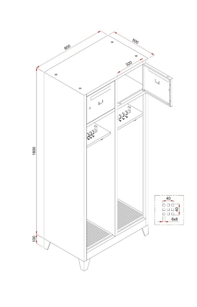 Šatní skříň na nohách pro hasiče, dvě oddělení, šířka 800 mm, výška 1900 mm, hloubka 500 mm.