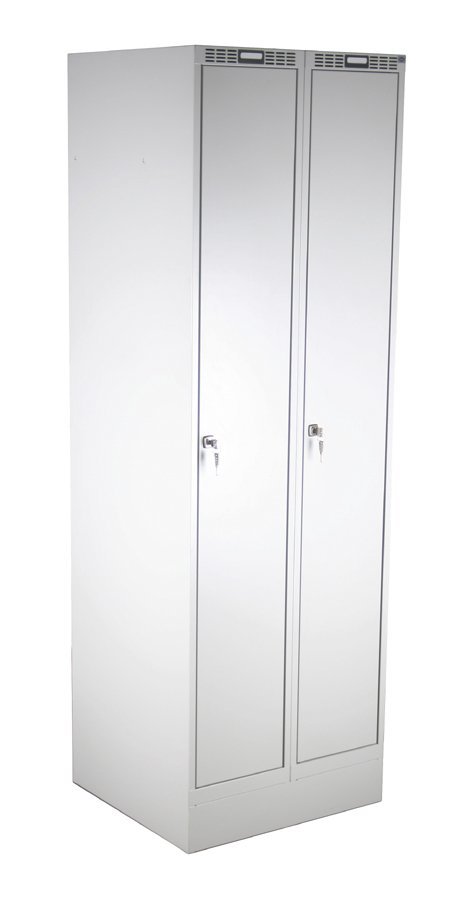 Dvoudveřová kovová šatní skříňka na soklu šířka 600, výška 1800, hloubka 500 mm, cylindrický zámek nebo uzávěr pro visací zámek. Možnost kombinace s lavicí typ A7660. Barva korpusu RAL 7035 světle šedá.