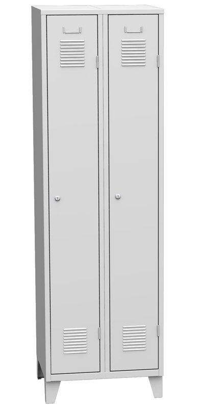 Dvoudveřová kovová šatní skříňka na nohách šířka 600, výška 1850, hloubka 500 mm. Barva korpusu RAL 7035 světle šedá.