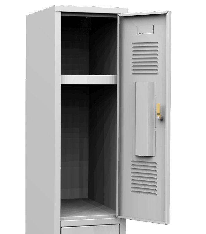 Dvoudveřová kovová šatní skříňka dělená 1/2 šířka 400, výška 1850, hloubka 500 mm, v horní části každého oddělení je polička a tyč se třemi plastovými posuvnými háčky. Barva korpusu RAL 7035 světle šedá.