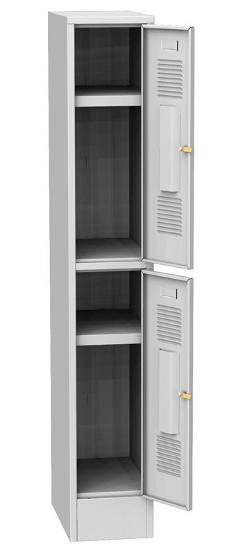 Dvoudveřová kovová šatní skříňka dělená 1/2 šířka 300, výška 1850, hloubka 500 mm, v horní části každého oddělení je tyč se třemi plastovými posuvnými háčky. Barva korpusu RAL 7035 světle šedá.