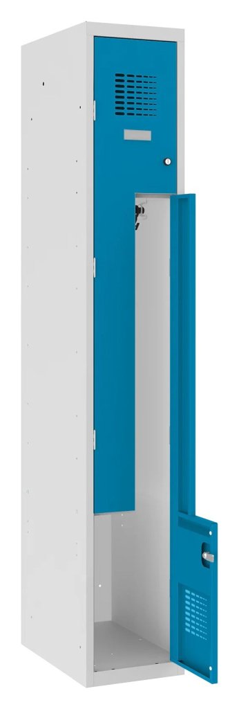 Dvoudveřová šatní skříňka se svařovanou konstrukcí a moderním designem ventilačního systému. Ideální do malých prostor. Výška 1800 x šířka 300 x hloubka 500 mm. Standardní vybavení skříňky: tyč s háčky, samolepící štítek na jméno. 16 barevných odstínů na výběr. Cylindrický zámek nebo uzávěr pro visací zámek.