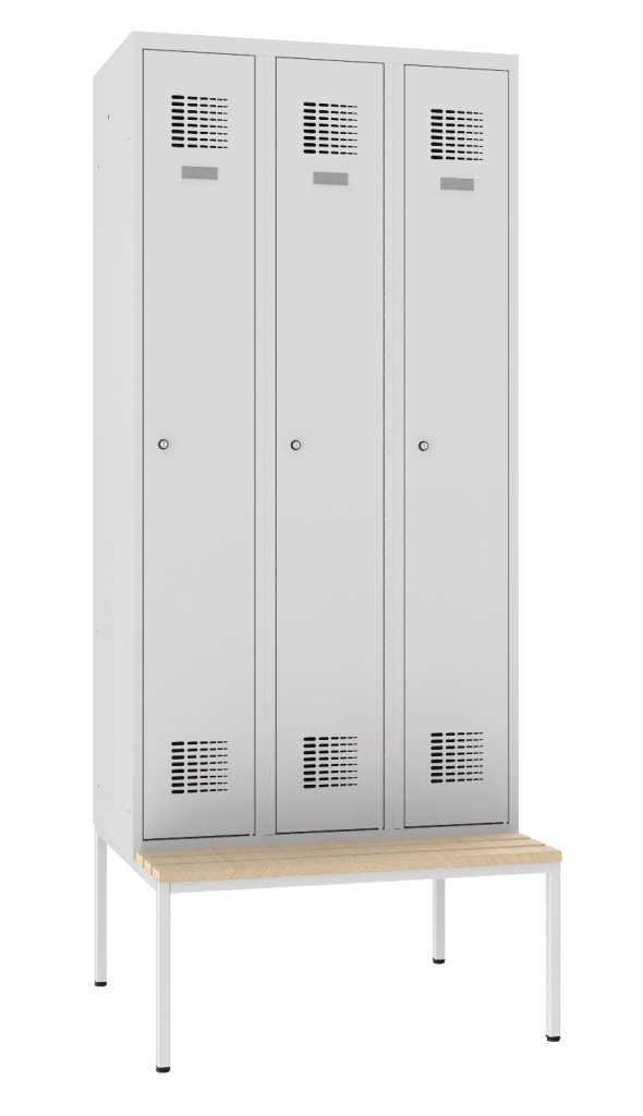 Třídveřová šatní skříňka s lavičkou a moderním designem ventilačního systému. Výška 2190 x šířka 900 x hloubka 500 mm. Standardní vybavení skříňky: tyč s dvěma háčky, háček na ručník, zrcadlo, police nad tyčí, samolepící štítek na jméno. Cylindrický zámek nebo uzávěr na visací zámek.
