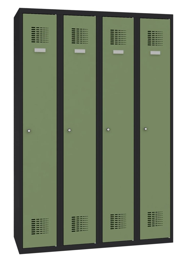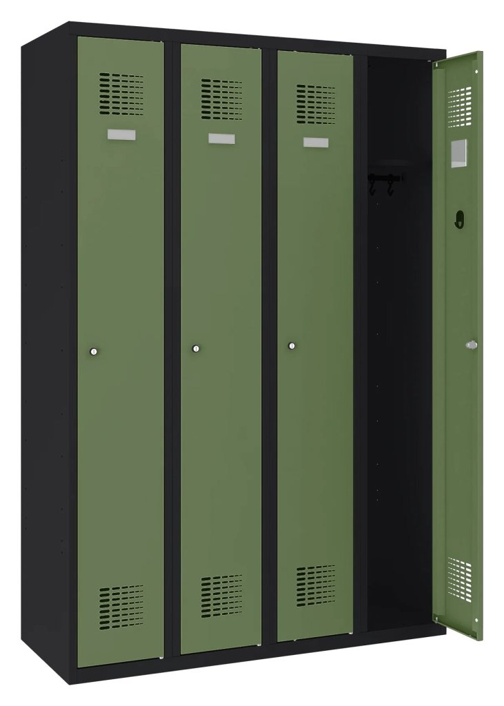 Čtyřdveřová šatní skříňka se svařovanou konstrukcí a moderním designem ventilačního systému. Výška 1800 x šířka 1200 x hloubka 500 mm. Standardní vybavení skříňky: tyč s dvěma háčky, háček na ručník, zrcadlo, police nad tyčí, samolepící štítek na jméno. Cylindrický zámek nebo uzávěr na visací zámek.