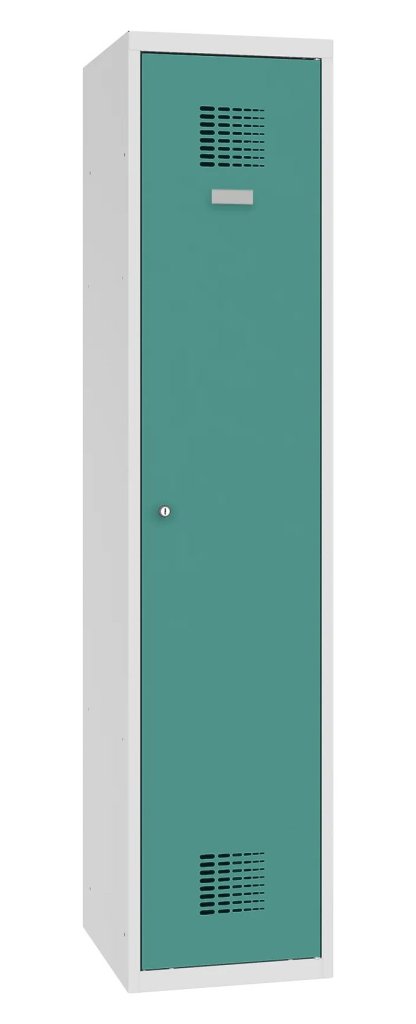Jednodveřová šatní skříňka se svařovanou konstrukcí a moderním designem ventilačního systému. Výška 1800 x šířka 300 x hloubka 500 mm. Standardní vybavení skříňky: tyč s háčky, police nad tyčí, samolepící štítek na jméno. 16 barevných odstínů. Různé druhy zamykání.