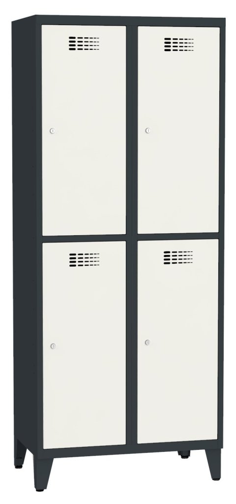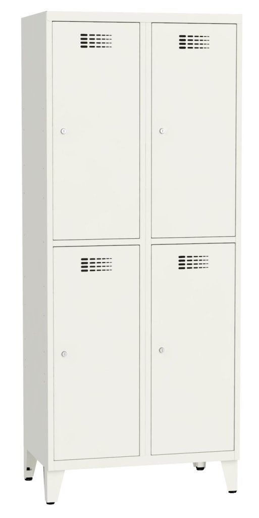Čtyřdveřová šatní skříňka se svařovanou konstrukcí a moderním designem ventilačního systému. Výška 1800 x šířka 800 x hloubka 500 mm. Standardní vybavení skříňky: tyč s háčky, samolepící štítek na jméno. 16 barevných odstínů na výběr. Cylindrický zámek nebo uzávěr pro visací zámek.