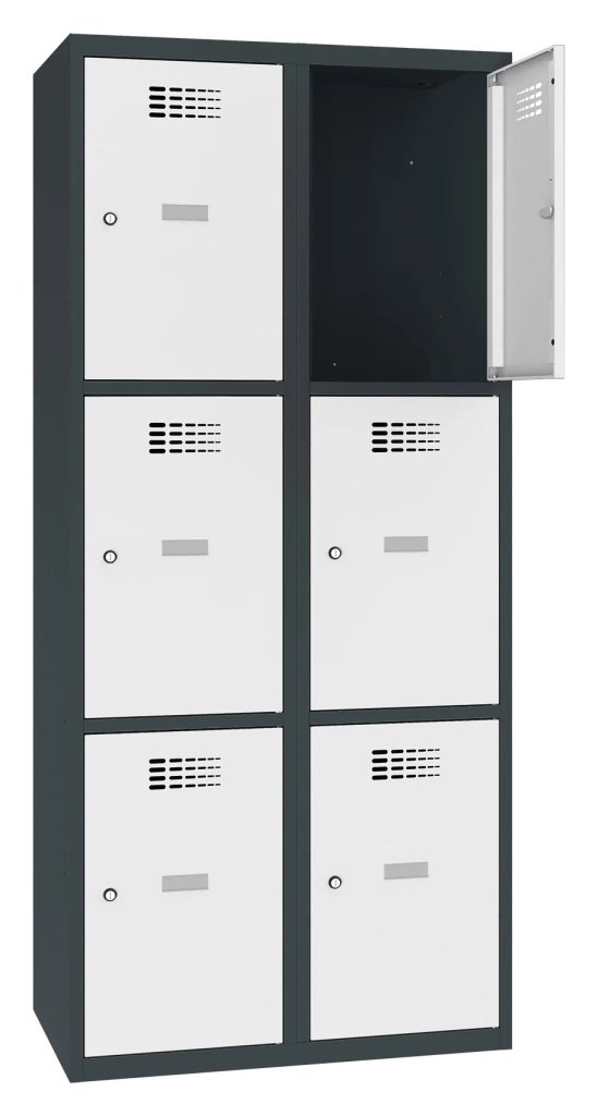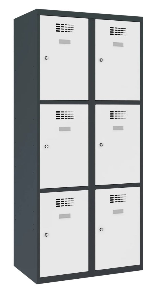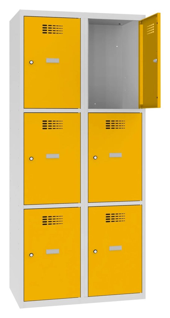Šestidveřová šatní skříňka se svařovanou konstrukcí a moderním designem ventilačního systému. Ideální do malých prostor. Výška 1800 x šířka 1200 x hloubka 500 mm. Standardní vybavení skříňky: tyč s háčky, samolepící štítek na jméno. 16 barevných odstínů na výběr. Cylindrický zámek nebo uzávěr pro visací zámek.