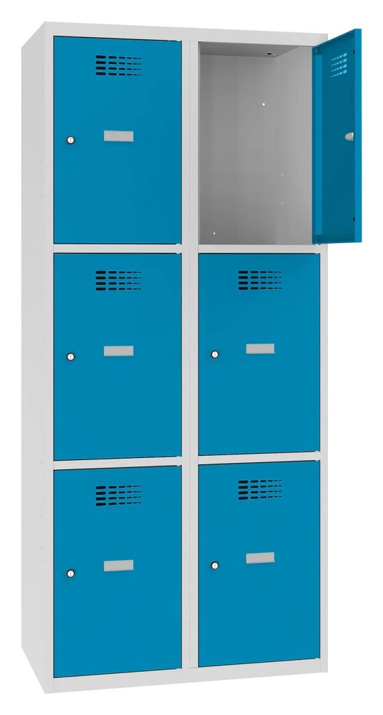 Šestidveřová šatní skříňka se svařovanou konstrukcí a moderním designem ventilačního systému. Výška 1800 x šířka 800 x hloubka 500 mm. Na dveřích samolepící štítek na jméno. 16 barevných odstínů na výběr. Cylindrický zámek nebo uzávěr pro visací zámek.