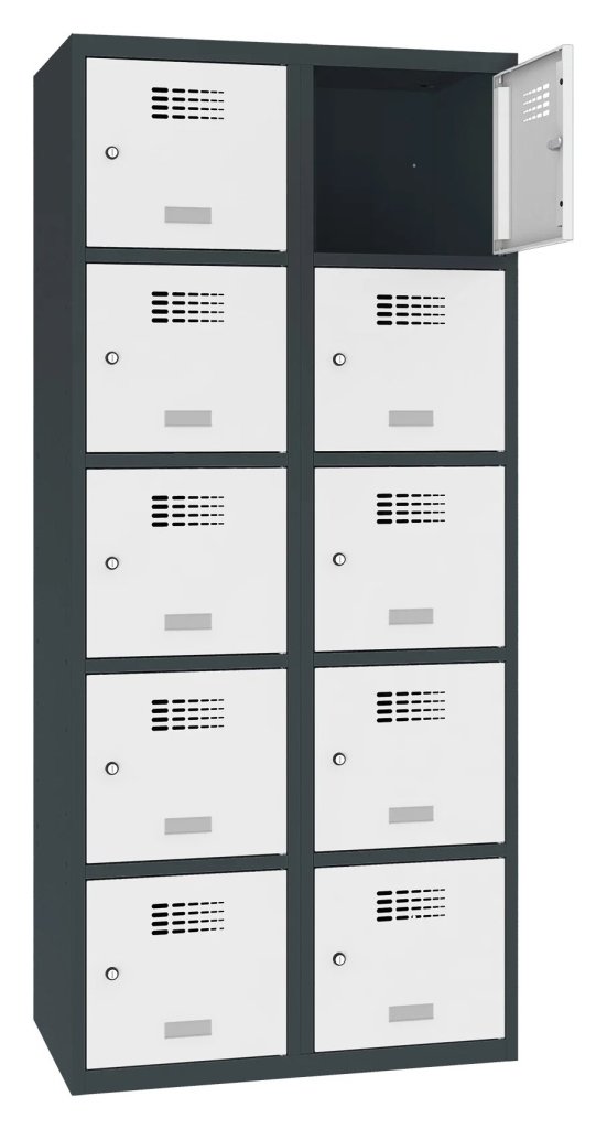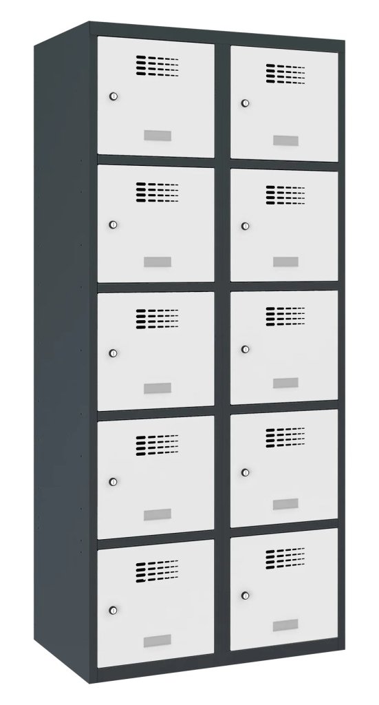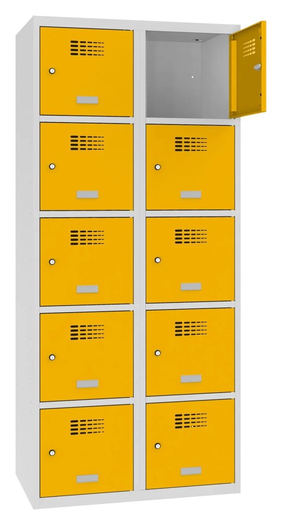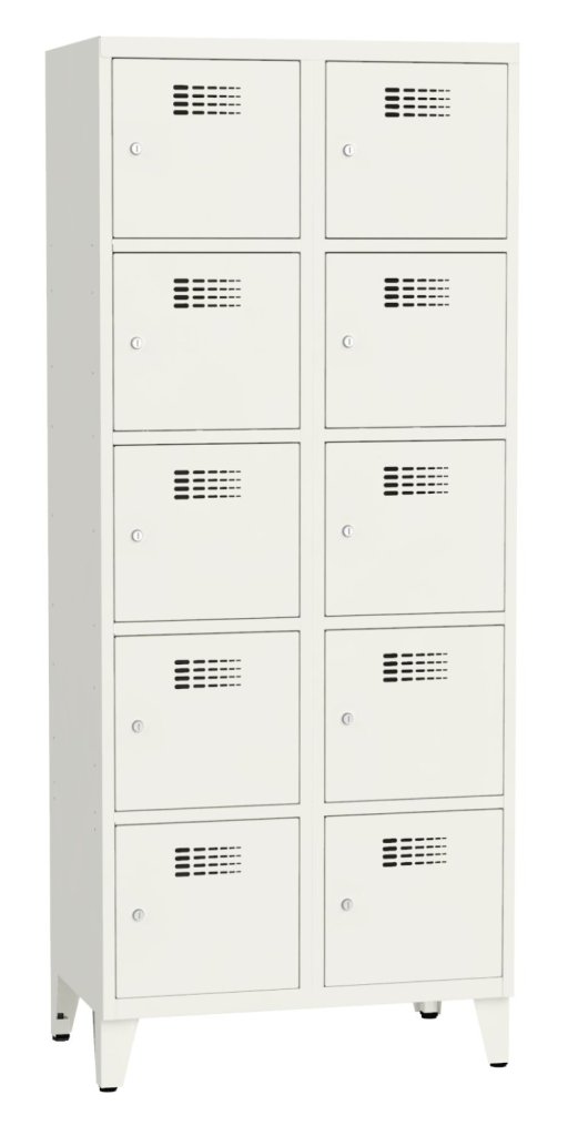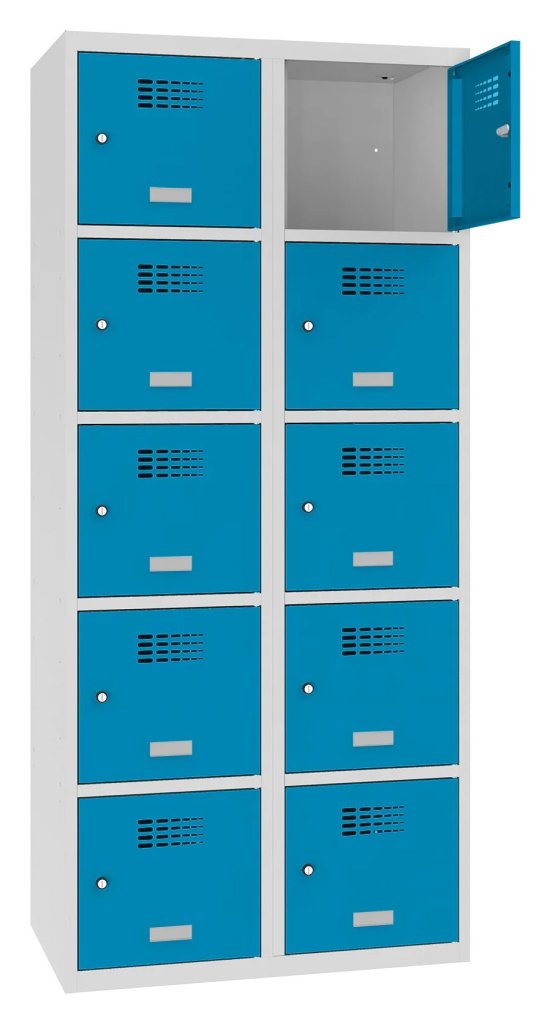 Desetidveřová šatní skříňka se svařovanou konstrukcí a moderním designem ventilačního systému. Výška 1800 x šířka 800 x hloubka 500 mm. Na dveřích samolepící štítek na jméno. 16 barevných odstínů na výběr. Cylindrický zámek nebo uzávěr pro visací zámek.
