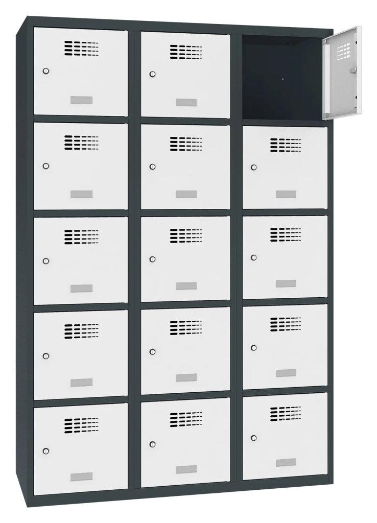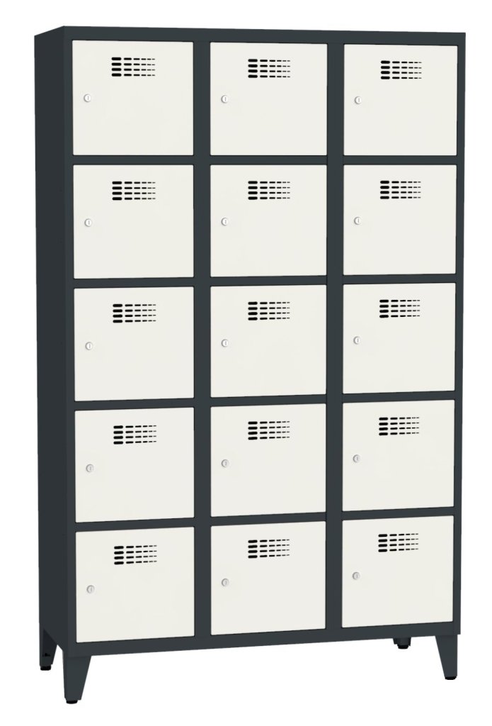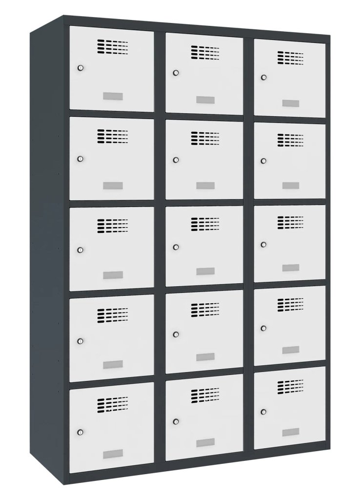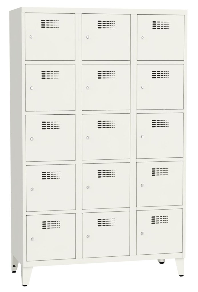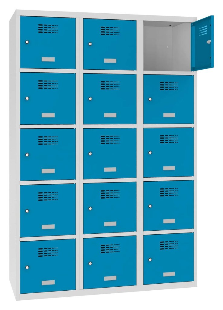 Patnáctidveřová šatní skříňka se svařovanou konstrukcí a moderním designem ventilačního systému. Výška 1800 x šířka 1200 x hloubka 500 mm. Na dveřích samolepící štítek na jméno. 16 barevných odstínů na výběr. Cylindrický zámek nebo uzávěr pro visací zámek.