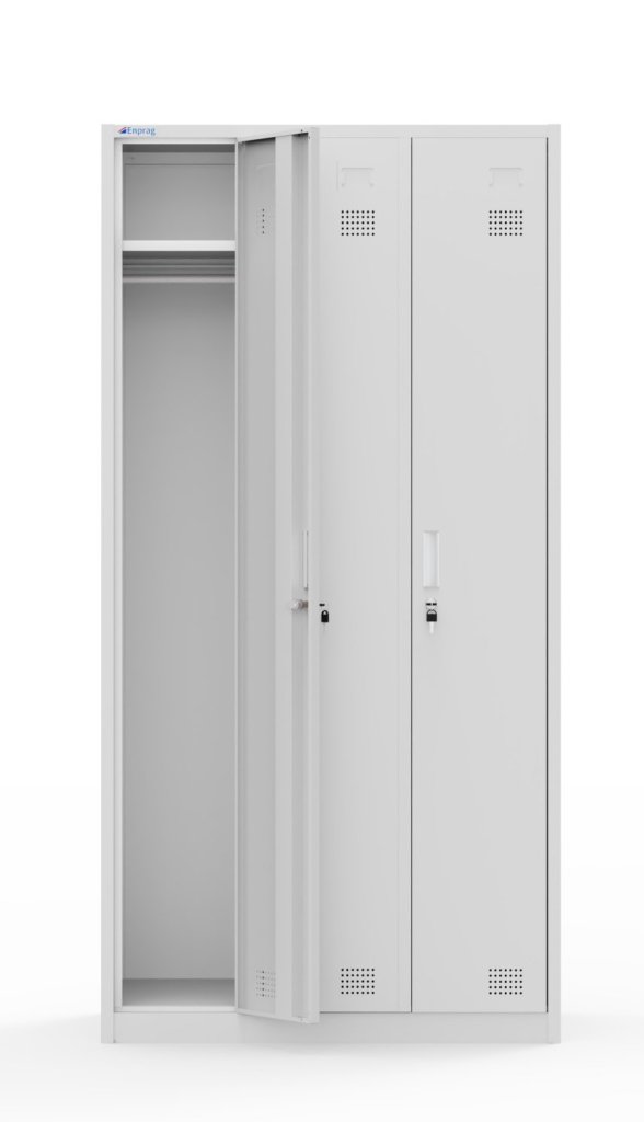 Šatní demontovaná skříňka, výška 1800 x šířka 900 x hloubka 500 mm. Zamykání - uzávěr pro visací zámek. Povrchová úprava práškovou barvou šedá RAL 7047.