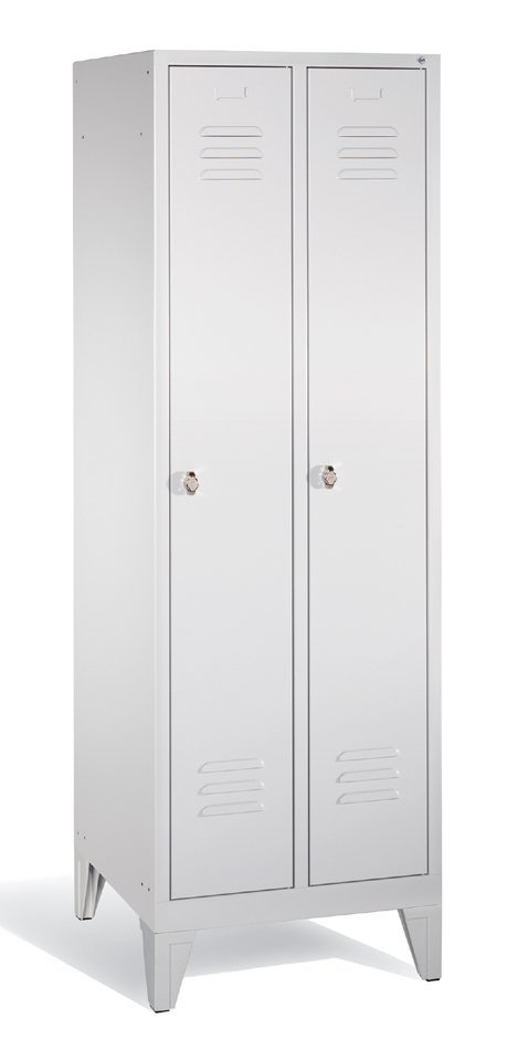 Dvouveřová kovová šatní skříňka na nohách, šířka 800, výška 1850, hloubka 500 mm. Barva korpusu RAL 7035 světle šedá.