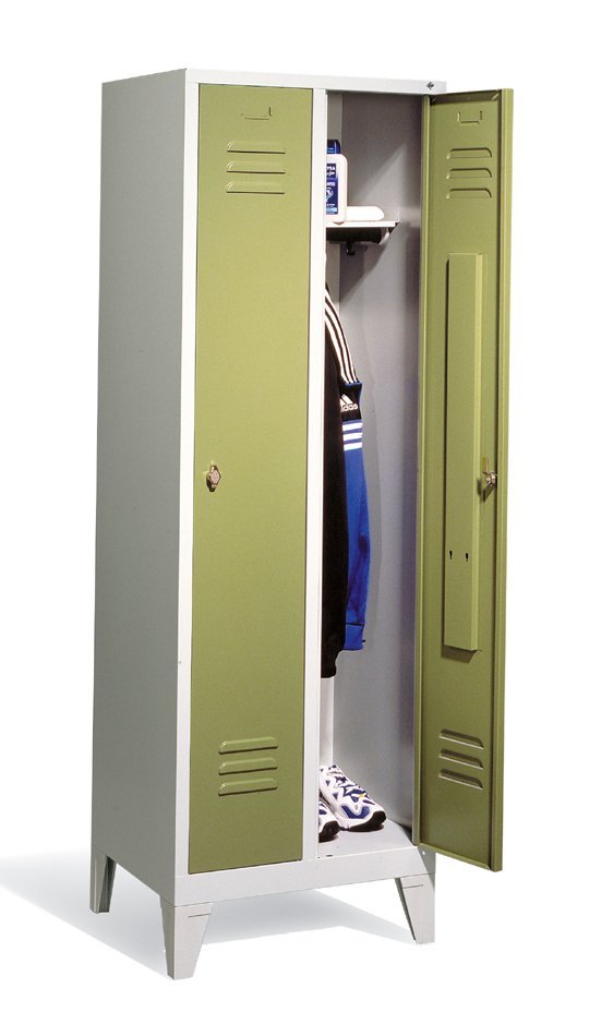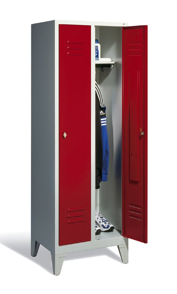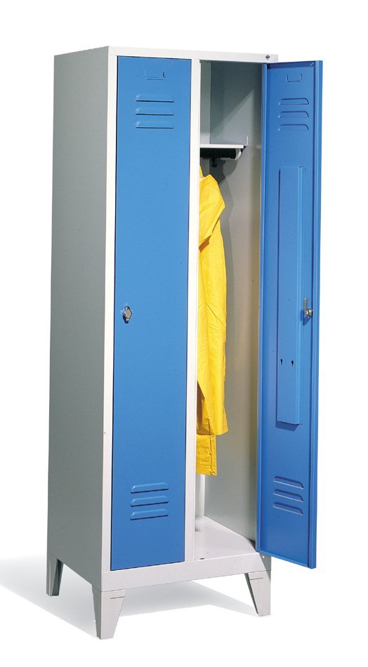 Šatní skříň dvoudveřová na nohách s robustní ocelovou konstrukcí. Součástí každého oddělení - police, tyč, 3 háčky. Uzávěr na visací zámek. Barevnost korpusu - světle šedá RAL 7035, barva dveří dle výběru. Rozměry v mm (V x Š x H) 1850 x 610 x 500.