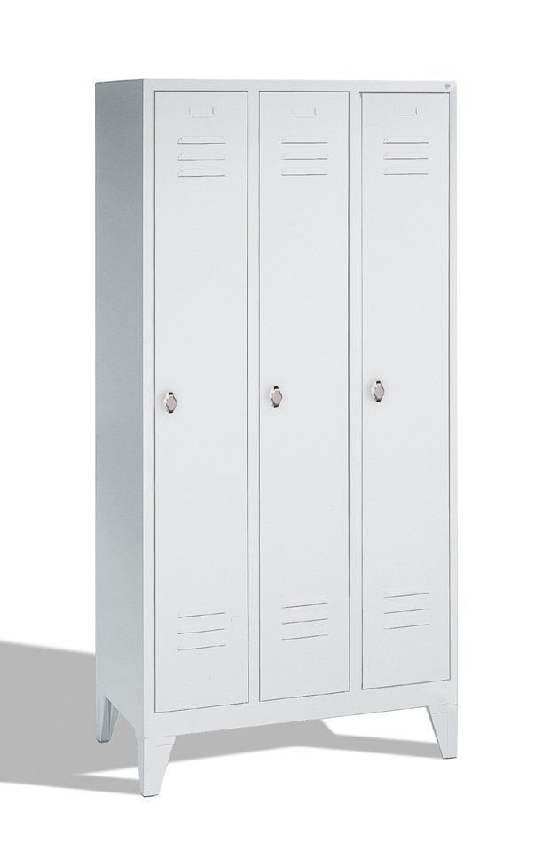 Třídveřová kovová šatní skříňka na nožičkách šířka 900, výška 1950, hloubka 500 mm, uzávěr nebo zámek. Barva korpusu RAL 7035 světle šedá.
