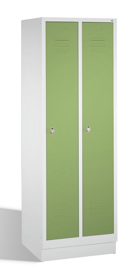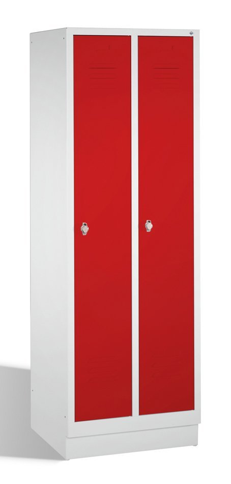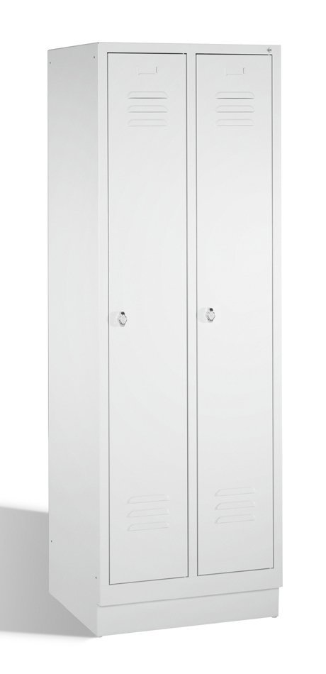Dvoudveřová kovová šatní skříňka na soklu šířka 600, výška 1800, hloubka 500 mm, cylindrický zámek nebo uzávěr pro visací zámek. Možnost kombinace s lavicí typ A7660. Barva korpusu RAL 7035 světle šedá.