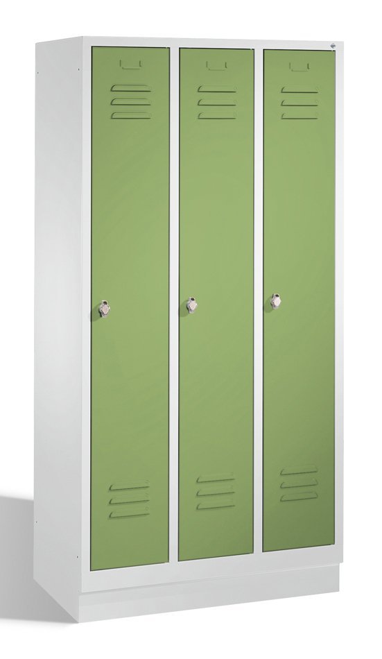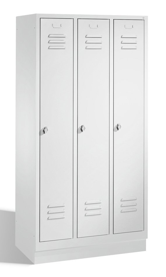 Třídveřová kovová šatní skříňka na soklu šířka 900, výška 1800, hloubka 500 mm, cylindrický zámek nebo uzávěr pro visací zámek. Barva korpusu RAL 7035 světle šedá.