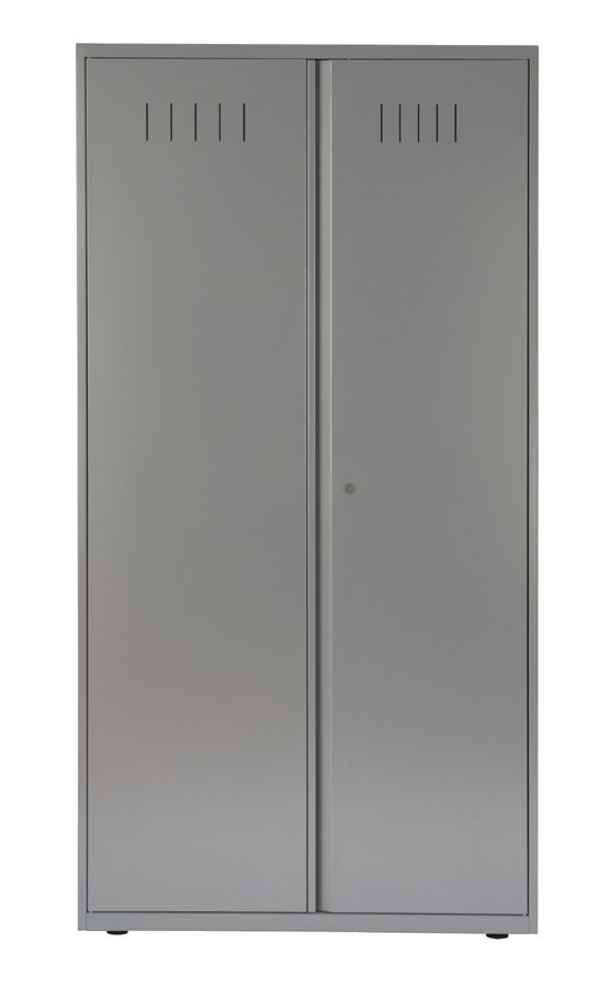 Šatní skříň SystemFile s plnými dveřmi. Výška 1947 - 1971, šířka 1000, hloubka 600 mm. Tuhý svařenec z ocelového plechu tloušťky 0,9 mm, rektifikační patky pro vyrovnání nerovností podlahy ±12 mm, záruka 10 let.