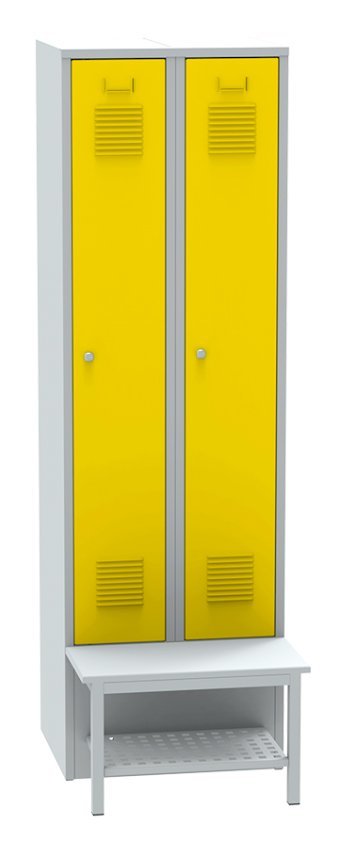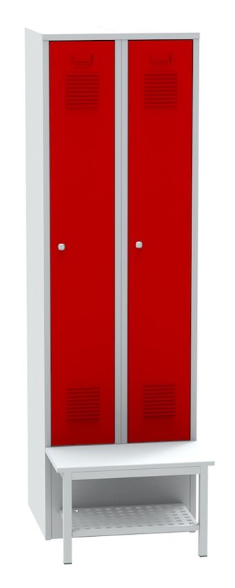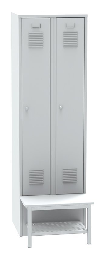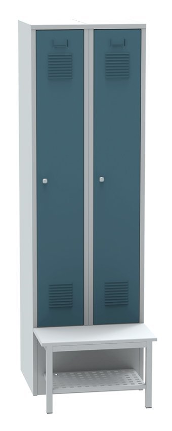 Dvoudveřová kovová šatní skříňka s předsazenou lavicí s roštem - výška 1850, šířka 600, hloubka 810 mm. Barva korpusu RAL 7035 světle šedá.