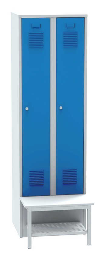 Dvoudveřová kovová šatní skříňka s předsazenou lavicí - výška 1850, šířka 600, hloubka 810 mm. Barva korpusu RAL 7035 světle šedá.