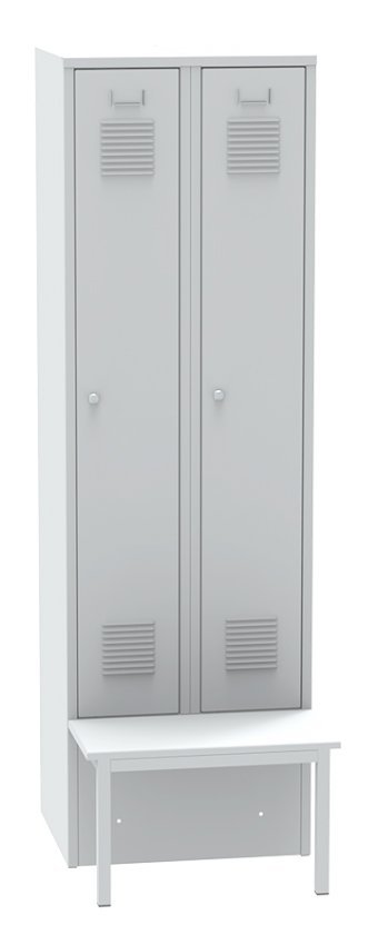 Dvoudveřová kovová šatní skříňka s předsazenou lavicí s roštem - výška 1850, šířka 600, hloubka 810 mm. Barva korpusu RAL 7035 světle šedá.