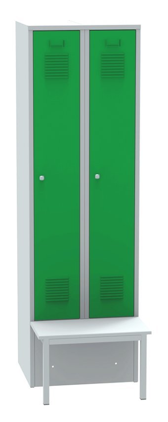 Dvoudveřová kovová šatní skříňka s předsazenou lavicí - výška 1850, šířka 600, hloubka 810 mm. Barva korpusu RAL 7035 světle šedá.