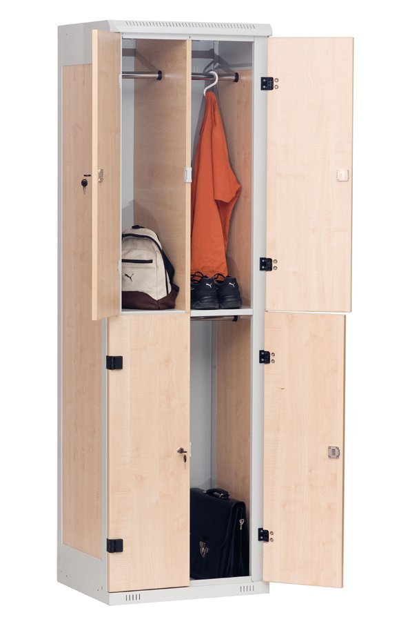 Kombinace ocelového plechu a laminované dřevotřísky vytváří nadčasový design šatní skříňky. Je vysoce kvalitní a zaručuje dlouhou životnost po stránce mechanické i estetické. Vybavení - 4x chromová šatní tyč, uzamykání - 4x cylindrický zámek se dvěma klíči. Barva kovu šedá RAL 7035, dekor laminované dřevotřísky - javor.