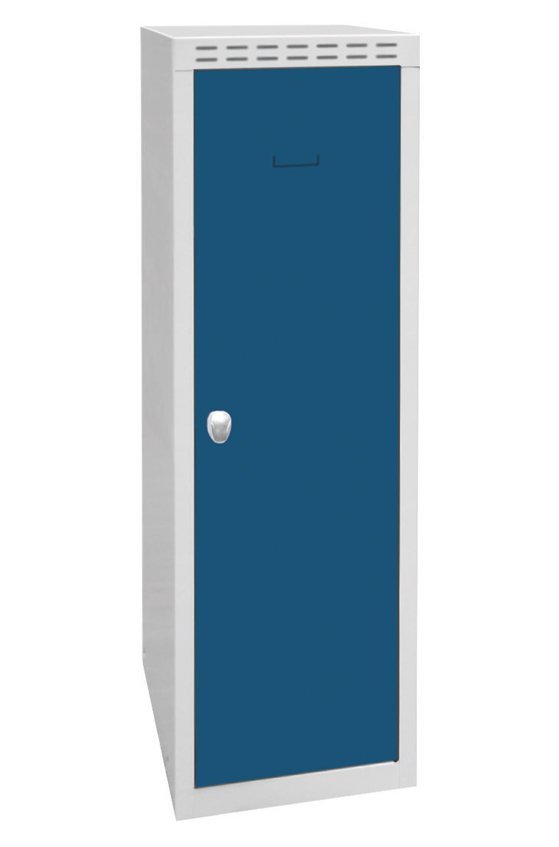 Šatní skříňka svařovaná s dvouplášťovými dveřmi pro větší bezpečnost, výška 1500 x šířka 300 x hloubka 500 mm. Uzamykání na cylindrický zámek nebo uzávěr pro visací zámek, vnitřní vybavení police s tyčí na ramínka a háček. Na přání s navařenými nohami - výška skříně s nohami 1650 mm. Barva korpusu RAL 7035 svetle šedá.