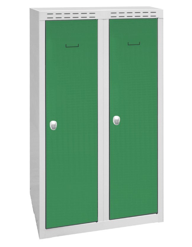 Dvoudveřová šatní skříňka svařovaná s dvouplášťovými dveřmi pro větší bezpečnost, výška 1800 x šířka 600 x hloubka 500 mm. Uzamykání na cylindrický zámek nebo uzávěr pro visací zámek, vnitřní vybavení každého oddělení police s tyčí na ramínka a háček. Na přání s navařenými nohami - výška skříně s nohami 1950 mm. Barva korpusu RAL 7035 světle šedá.